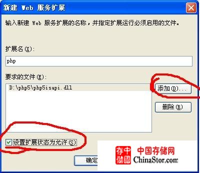 输入phpisapi.dll文件的路径,设置扩展状态为允许: