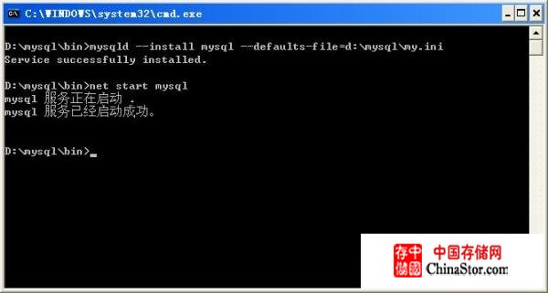 四、安装mysql服务,切换到mysql/bin目录,执行如下命令,安装并启动mysql服务,注意my.ini配置文件的路径要写准确