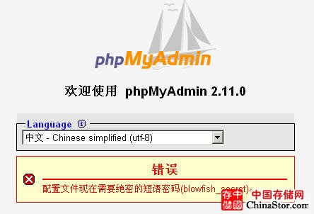 如果认证方法设置为 cookie,就需要设置短语密码,设置为什么密码,由您自己决定,这里不能留空,否则会在登录 phpMyAdmin 时提示如下图所示的错误。