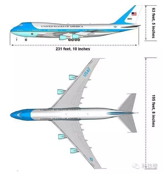 机身长度231英尺10英寸,宽度是195英尺8英寸,高度是63英尺5英寸