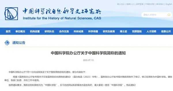 中国科学院办公厅7月11日向全院发送了关于我院简称的相关通知,部分内容如下: