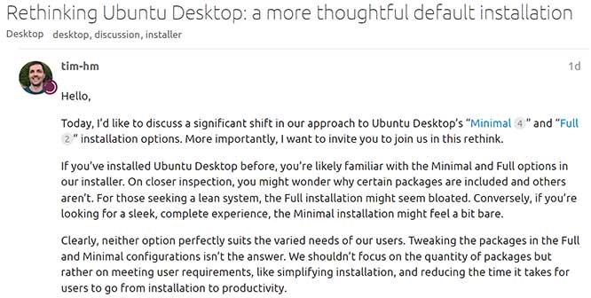 他还说道,随着当今互联网的广泛普及,获取必需的应用程序不再是障碍。如果对安装选项进行简化后,就可以减少 ISO 大小、减少测试需求,以及简化安装过程。