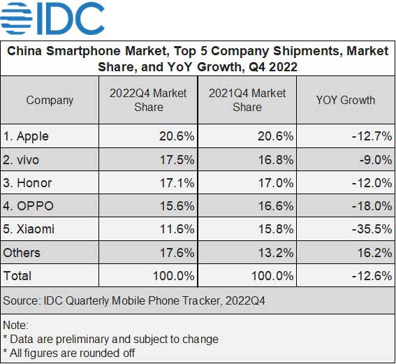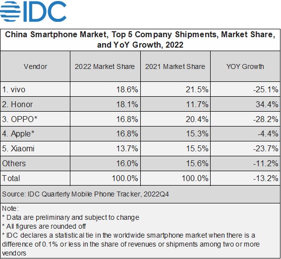 荣耀是唯一一家在 前 5 名中2022 年实现增长的,这要归功于较低的比较基准年及其积极的产品组合开发。在 22 年第四季度,尽管上个月因 COVID 导致中断,但苹果位于郑州的 iPhone 组装工厂仍设法在 12 月恢复正常。产量的恢复,加上光棍节的在线购物节,使苹果能够保持季节性的季度环比(QoQ)增长。