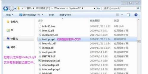 1)如果能找到与我们的计算机操作系统相同,IE也相同的计算机,可以在这台计算机上把inetcpl.cpl文件拷贝过来,复制到C:\windows\system32目录下(把已经损坏的inetcpl.cpl文件删除)。