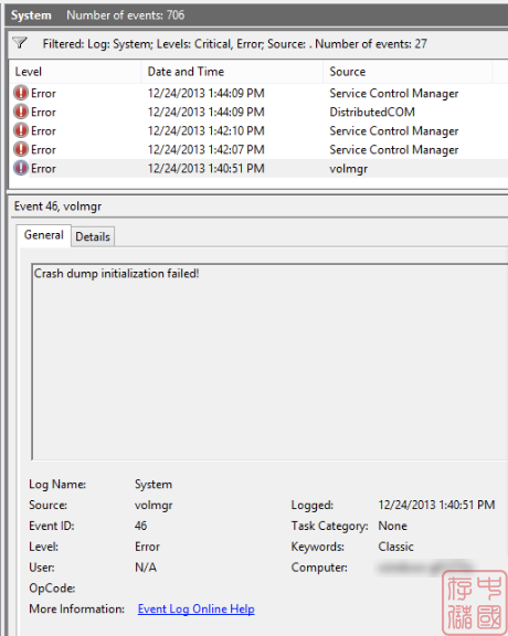 <EventData> <Data Name="BugcheckCode">0</Data> <Data Name="BugcheckParameter1">0x0</Data> <Data Name="BugcheckParameter2">0x0</Data> <Data Name="BugcheckParameter3">0x0</Data> <Data Name="BugcheckParameter4">0x0</Data> <Data Name="SleepInProgress">0</Data> <Data Name="PowerButtonTimestamp">0</Data> <Data Name="BootAppStatus">0</Data> </EventData>但是,volmgr 记录的事件 ID 为 46: 故障转储初始化失败!。 如果计算机在没有配置的转储文件的情况下启动,则可能会发生此事件。 默认转储文件是页面文件。