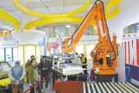 在第25届广西科技活动周上南宁展厅内的工业机器人。