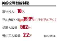 作为国内三大家电集团之一的美的也在去年加快了智能化改造步伐。日前,美的空调首次对外公开其位于广州南沙工业园的全智能生产线。截至去年底,美的空调在自动化生产改造已累计投入10亿元,平均自动化率为16.9%,高于行业7%的平均水平。而这两条全智能生产线内机自动化率达到64%,外机达到65%。