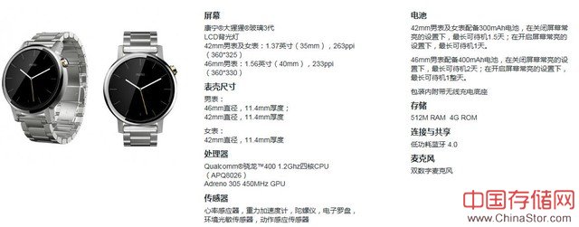 第二代Moto 360配置信息(图片引自摩托罗拉官网)