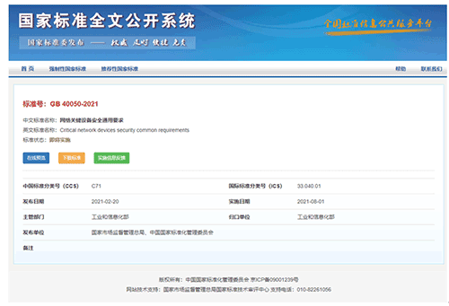 2020年2月20日,国家市场监督管理总局(国家标准化管理委员会)发布2021年第1号公告,批准了7项强制性国家标准和1项强制性国家标准修改单,其中包含1项通信领域的强制性国家标准:GB 40050-2021《网络关键设备安全通用要求》。