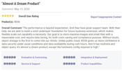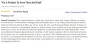 译:产品性能比预期的好,服务到位。基于这个产品,我们为未来的业务增长提供了坚实的底层支撑。该产品主要用来存储大量小文件和图片,价格合理,方便拓展。数据分层的功能有利于我们节约成本的同时符合合规要求。相对于公有云,XEOS在数据安全和数据可用方面更值得信赖,还支持多站点和对象查询的功能。对我们的业务而言,除了硬件配置要求较高外,这是个非常理想的产品。