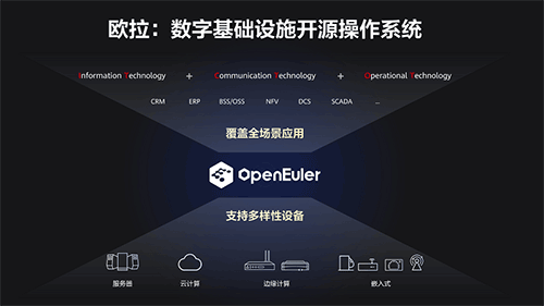 本次欧拉全新升级,同时支持服务器、云计算、边缘计算、嵌入式等各种形态设备的需求。支持多样性计算,致力于提供安全、稳定、易用的操作系统;并通过为应用提供确定性保障能力,支持OT领域应用及OT与ICT的融合。至此全新发布的欧拉操作系统可覆盖从IT、CT到OT数字基础设施全场景。