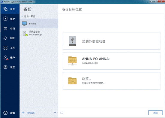 如果插入了外部驱动器,则会自动检测到该驱动器,并将显示在可用备份目标列表中。Acronis Cyber Protect Home Office还会检测网络中的NAS并将其显示在可用目标列表中。如果未列出该位置,请单击“浏览”,然后选择一个位置: