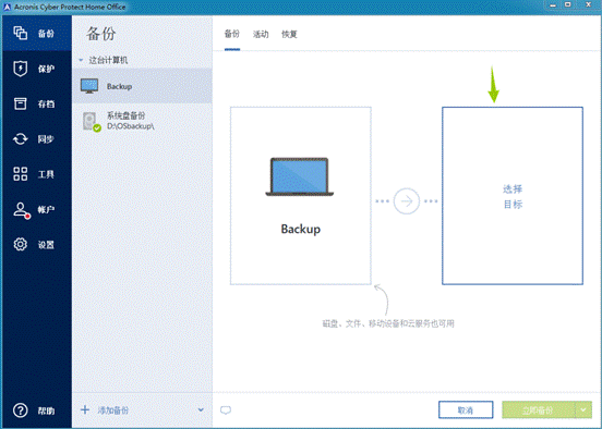 6、单击选择目标,然后选择备份目标。如果插入了外部驱动器,则会自动检测到该驱动器,并将显示在可用备份目标列表中。Acronis Cyber Protect Home Office还会检测网络中的NAS并将其显示在可用目标列表中: