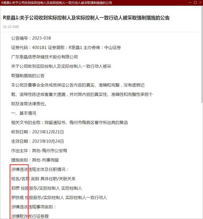 近日,R紫晶1 (原紫晶存储)发布公告称,经公司向梅州市公安局了解,根据相关规定,实际控制人郑穆、实际控制人一致行动人罗铁威涉嫌欺诈发行证券罪,现羁押在梅州市梅县区看守所。据了解,现已被梅州市检察院批捕。
