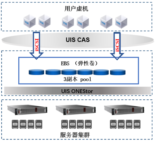 超融合架构下的存储服务以典型的分布式存储架构为主,通过Linux Cgroup等技术,将存储服务算力从系统中进行隔离使用,存储服务以更加轻量化方式运行,性能参数更加匹配硬件资源。其中,块存储服务是超融合使用的主要场景。
