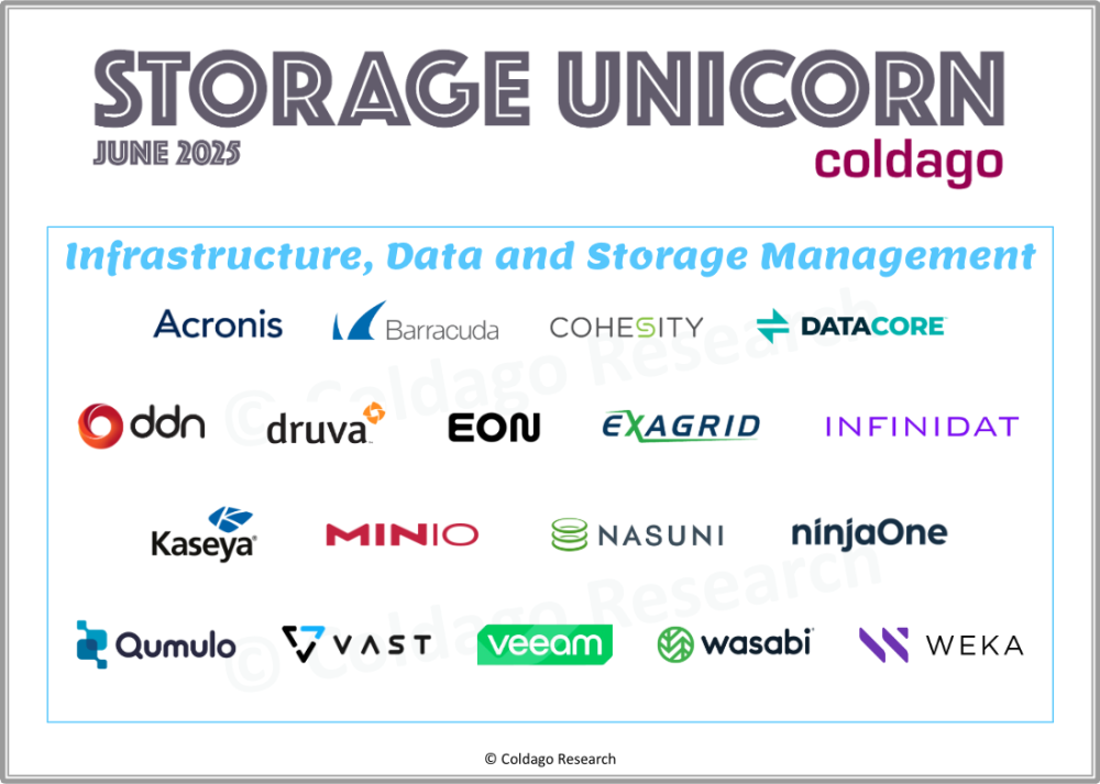 这 18 家独角兽公司按字母顺序排列为:Acronis、Barracuda Networks、Cohesity、DataCore、DDN、Druva、Eon、ExaGrid、Infinidat、Kaseya、MinIO、Nasuni、NinjaOne、Qumulo、VAST Data、Veeam Software、Wasabi Technologies 和 WEKA。