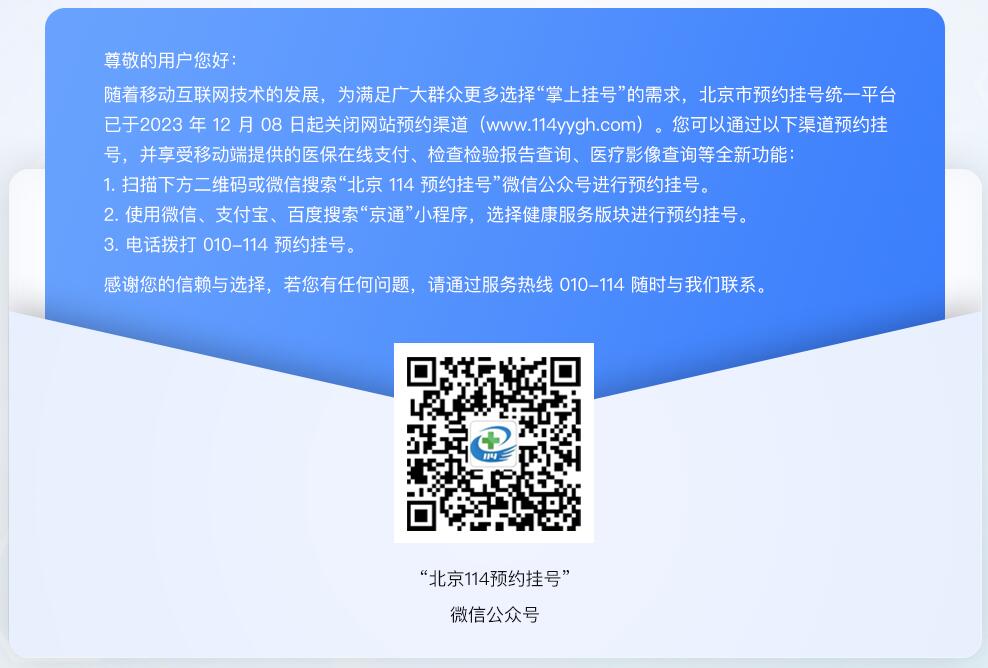 目前北京114预约挂号已经停止网站预约服务,可访问其微信公众号或到“京通”小程序中进行挂号。