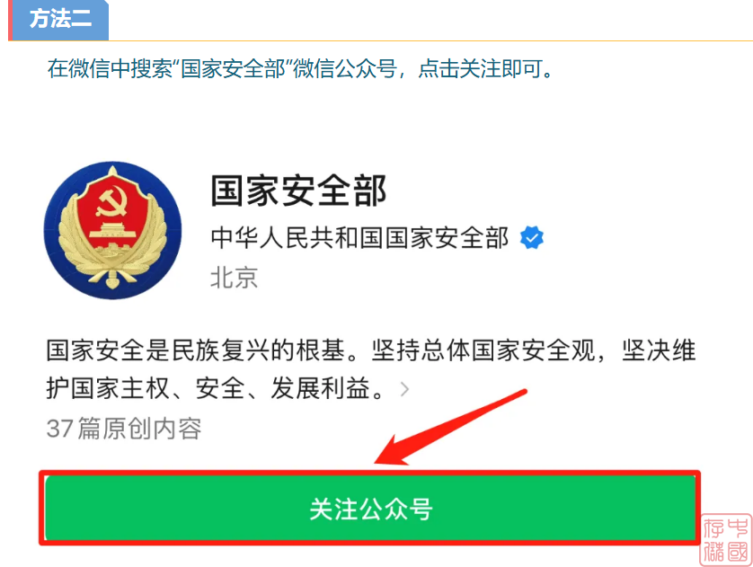 “国家安全部”微信公众号是国家安全部官方信息发布的权威渠道,是开展全民国家安全宣传教育的重要阵地。