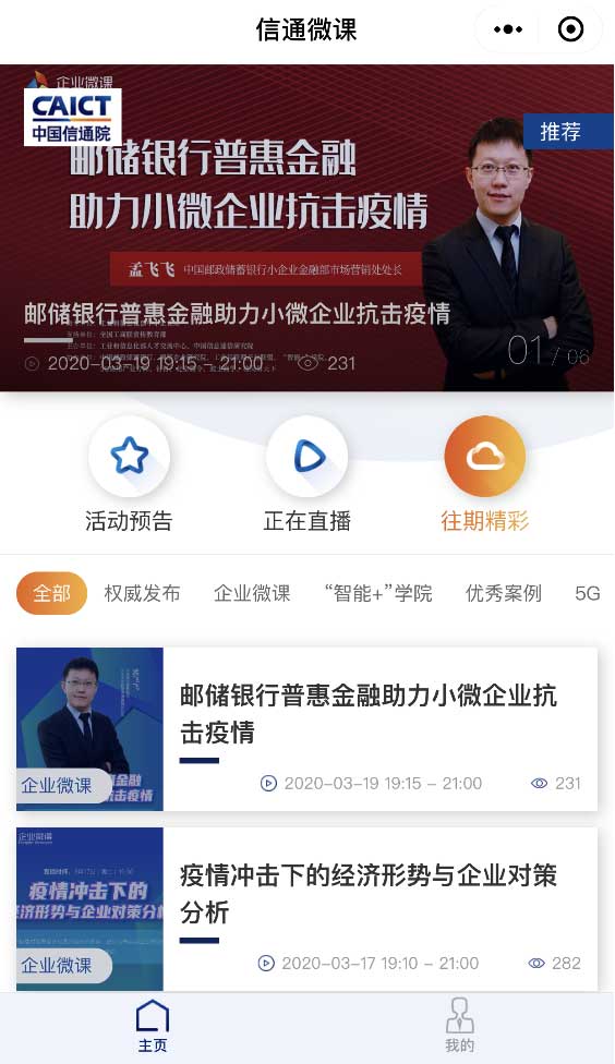权威发布栏目主要内容有院白皮书发布及各所研究报告等的发布,目前采用录播上传的方式,后期会将线下的发布会线上直播或录播上传,多为PGC,课程列表如《全国智慧城市产业研究报告》、《“互联网+行业”个人信息保护研究报告》;企业微课栏目主要为与工信部合作直播内容,为市场客户提供多方位学习内容;“智能+”学院栏目主要与“智能+”学院平台合作,将公益直播等录播上传,为UGC内容,课程列表目前为智能+学院公益直播内容;优秀案例栏目主要为院横向市场合作的成功案例短视频,为PGC和UGC结合内容,目前有数字经济、区块链及5G业务介绍及优秀案例分享,后续有更多合作案例展出供客户参考。其余业务板块多为相关业务的专家讲座、业务介绍、线下展会及会议录像、线上直播等内容。更多板块内容可浏览“信通微课”小程序。主视觉如下图: