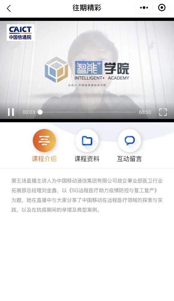 “信通微课”是由中国信通院创建的以视频为主要形式的媒体平台,是中国信通院作为国家高端专业智库、产业创新发展平台的重要传播媒介之一。“信通微课”集权威发布、热点讨论、线上直播、微课讲座等多种形式于一身,不仅是中国信通院的权威观点、科研成果、重要活动的开放传播平台,也是聚合产业力量和助力企业发展的良好宣传窗口。目前,“信通微课”以轻快简便的小程序方式运行,现为运行初期,粉丝数量已超6000人。