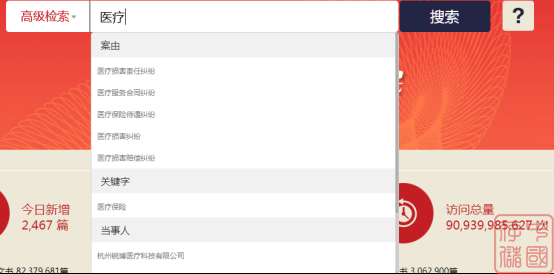 快捷检索支持关键词联想推荐。在快捷检索框中输入关键词后,联想推荐案由、关键字、审理法院、当事人、审理人员、律师、律所、法律依据八个类型的信息。