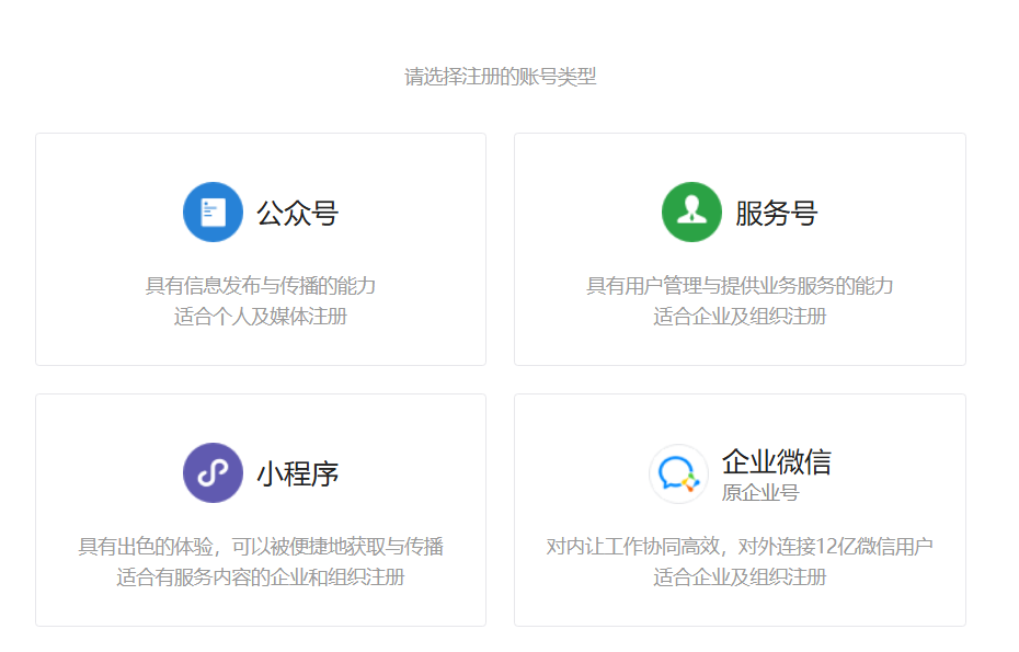 开通地址mp.weixin.qq.com,根据个人情况,选择是开通公众号还是服务号: