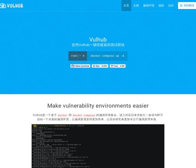 Vulhub官网是一个面向大众的开源漏洞靶场,无需docker知识,简单执行两条命令即可编译、运行一个完整的漏洞靶场镜像。旨在让漏洞复现变得更加简单,让安全研究者更加专注于漏洞原理本身。