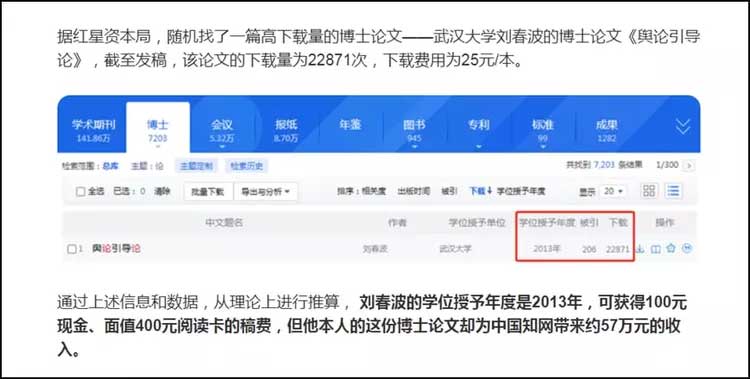 据悉,博士论文、硕士论文在中国知网出版,作者本人最高仅可获得100元现金,以及400元面值的检索阅读卡作为稿酬。但是作者的论文每在中国知网上被下载一次,平台就会收取15元/本甚至25元/本的费用,据推算,一篇或只发出500元稿费的论文,可能给中国知网带来了约57万元的收入。高盈利的背后是作者的微薄收益。