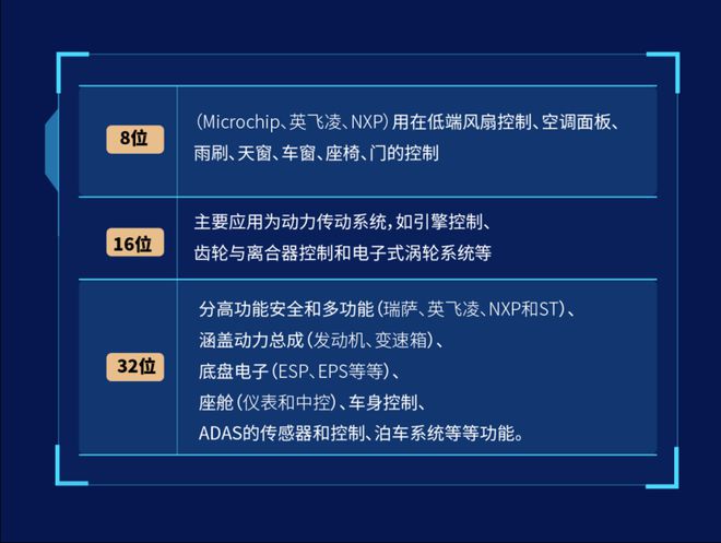 在车规级芯片中,以32位数的芯片最为稀缺。据了解,车规级芯片主要包含8、16、32位三种,位数越多越复杂,处理能力越强。随着汽车电子电控功能日趋复杂,32位芯片占比在逐渐提高。