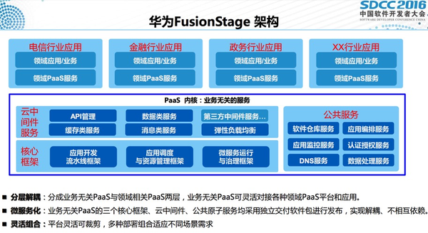 针对目前企业IT的挑战和趋势,俞岳表示,前一代的碎片化的PaaS平台很难满足企业的敏捷开发和快速上线的需求。华为基于多年企业应用开发实践以及外部客户访谈,华为推出新一代PaaS产品FusionStage。FusionStage采用分层的架构,分成业务无关PaaS内核以及领域相关PaaS服务两层,PaaS内核可灵活对接各种领域PaaS平台和应用,包括三个核心框架、云中间件、公共原子服务,三者均采用服务化的方式开发,使用独立软件包进行交付,组件和服务之间实现解耦、不相互依赖。同时,平台里面也融入了Docker、Kubernetes、Mesos、 Yarn这些最新的云计算技术。