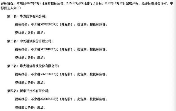 该项目2022年9月8日发布招标公告,2022年9月29日进行了开标,2022年 9月29日完成评标,经评标委员会评审,华为以32.97亿元的报价夺魁,中兴、烽火、新华三报价分别为31.76亿、30.67亿、27.21亿。